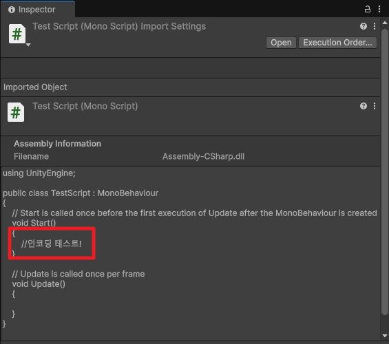 visual studio에서 도구 - 옵션 - 텍스트 편집기 - C#을 통해 들어와 .editorconfig파일을 생성해서 안에 인코딩 내용 추가을 추가해주고 새로 스크립트 파일을 생성해 저장해보면 제대로 한글이 나오는걸 확인 가능!