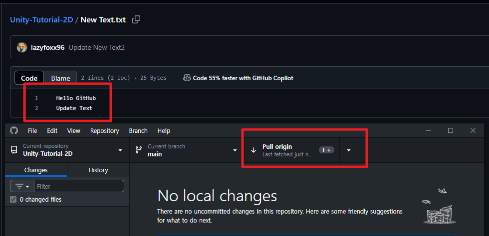 반대로 github저장소에서 파일에 접근해 파일을 수정하면 Pull을 통해 Local저장소로 변경된 파일을 가져옴