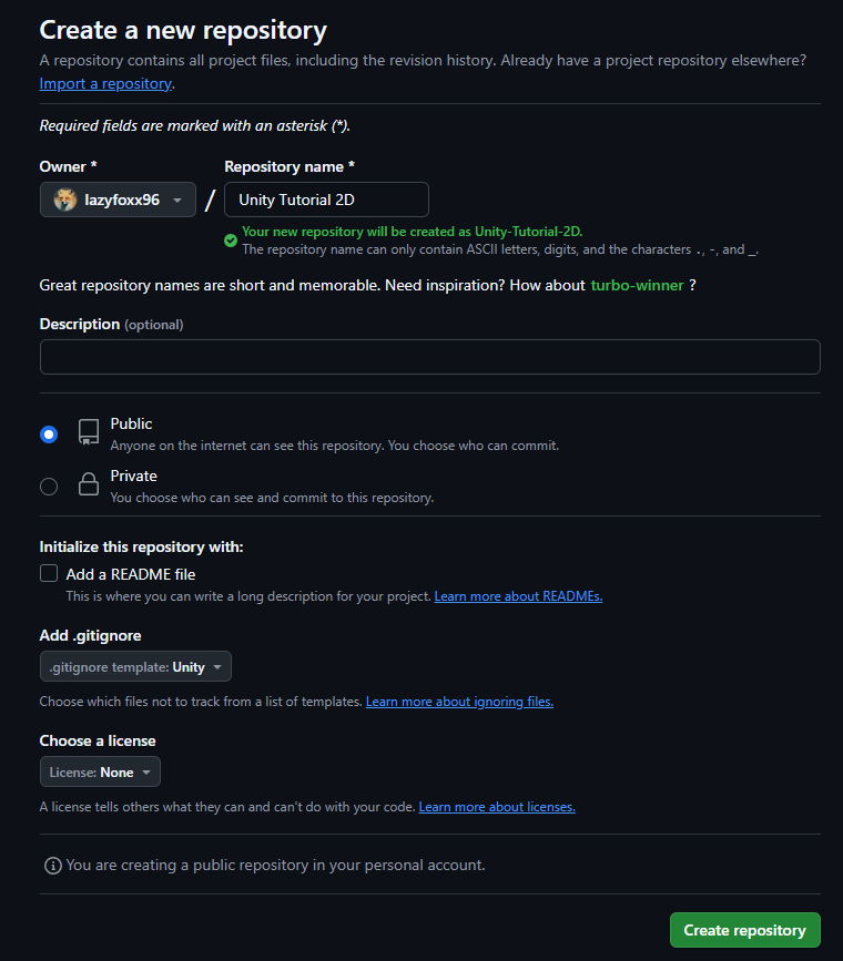 이후 Repository생성. 불필요한 파일들이 저장소로 올라가지않게 .gitignore에 Unity로 설정해줌