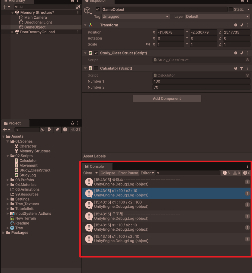Debug.Log($"c1 : {c1.number} / c2 : {c2.number}");