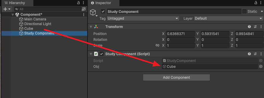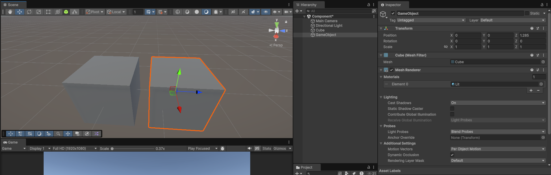 오브젝트 제어쪽에서는 빈 게임 오브젝트를 생성해 component를 추가해주고 cube와 동일하게 mesh filter, meshRenderer를 맞춰주니 모양이 똑같이 변함