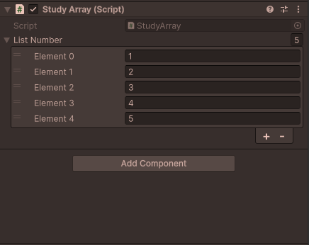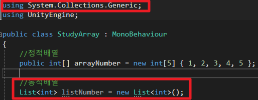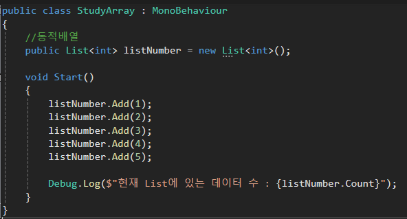 배열과 List를 직접 스크립트에서 구현한 코드 여기서 새로웠던건 앞에 접근제한자 public을 붙였을 경우 유니티 에디터에서도 배열을 확인할 수 있었던것인데 코드상에서는 배열의 추가나 순서변경등이 어려웠다면 유니티 에디터에서는 이런 부분에서 좀더 자유롭게 변경하고 순서를 바꾼다던가 추가, 삭제가 가능했다.