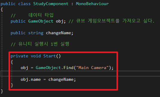 코드상에서 데이터 타입이 GameObject의 대해서도 실습해보았는데 처음에는 대상이 None으로 되어있어서 찾지 못했지만 하이라키에서 직접 obj에 객체 오브젝트를 입력해주니 이름이 변하는것을 확인