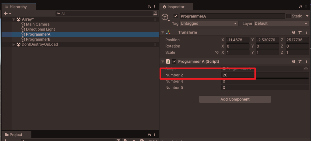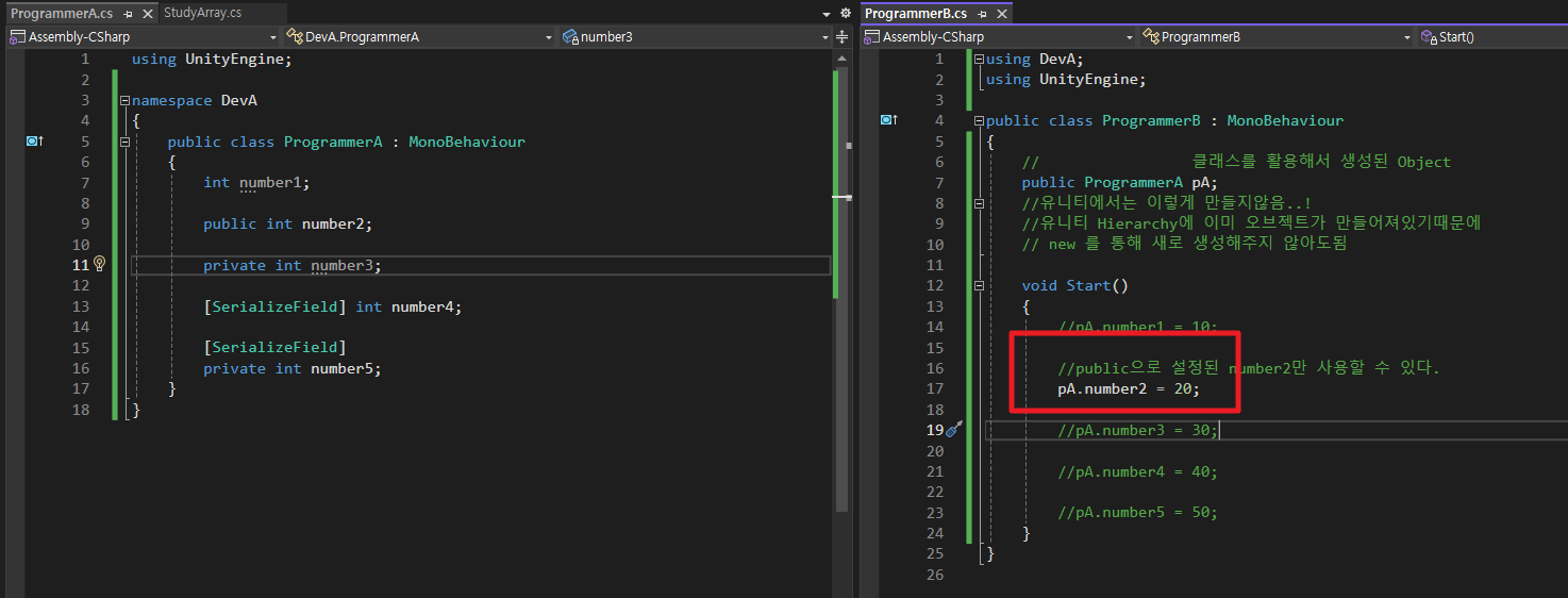 scriptA와 B를 생성해 B에서 A의 객체를 생성해 접근제한자를 확인해보았는데 public빼고는 모두 접근이 불가능했고 유니티 에디터 상에서도 B에서 PA를 지정해주지 않는 이상 number2에대한 접근을 허용하지 않았다. 하지만 직접 B의 pA객체에 A를 넣어줌으로써 Start() 되었을때 number2가 20으로 변경되는걸 확인할 수 있었다.