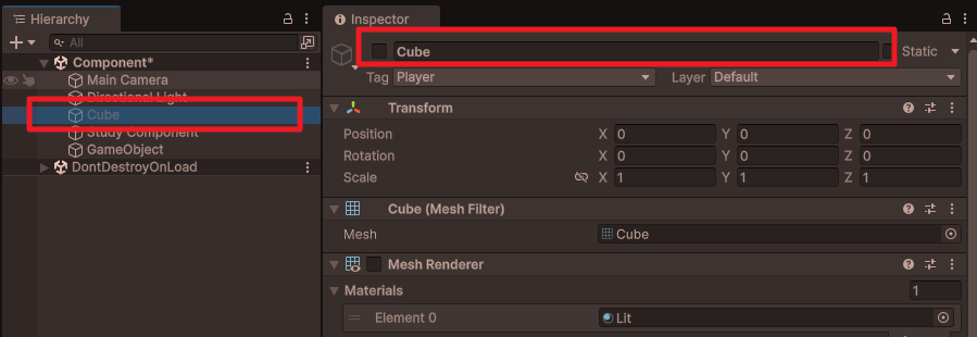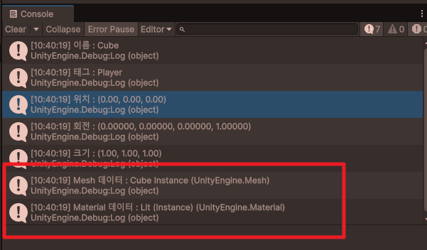 // MeshRenderer 컴포넌트에 접근해서 material데이터를 log메세지로 출력하는 기능