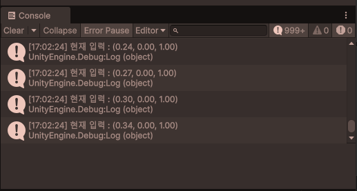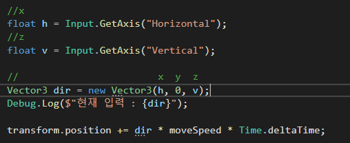 마지막으로 오브젝트 캐릭터의 이동을 더 부드럽게 보여주기위해서 GetAxis를 추가해 x, y, z의 x, z에 Horizontal과 Vertical을 넣어주고 wasd로 확인해봄