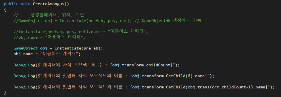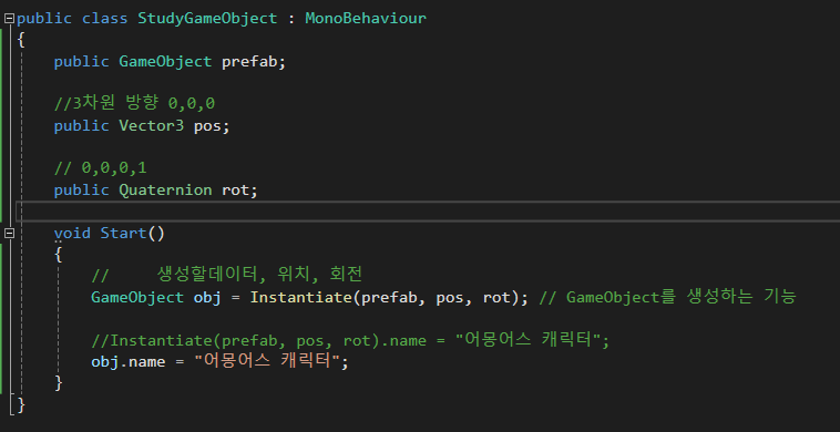게임 오브젝트를 만들고 전에 만들었던 어몽어스 캐릭터 프리팹을 넣어 생성할 위치와 회전등을 넣어 start시 캐릭터 생성