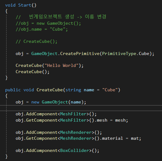 게임 오브젝트에 rimitiveType을 코드상에서 추가 CreatePrimitive를 통해 기본 제공 도형을 가져올수있다.