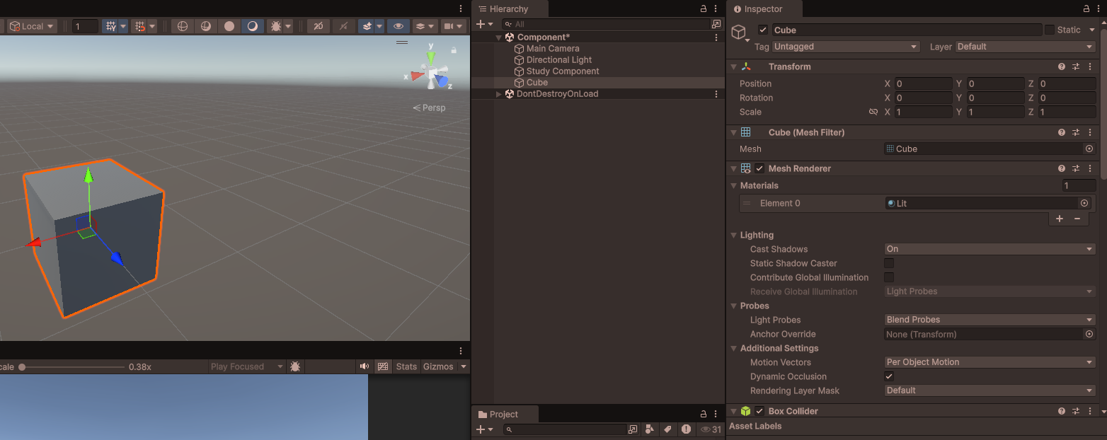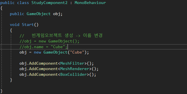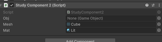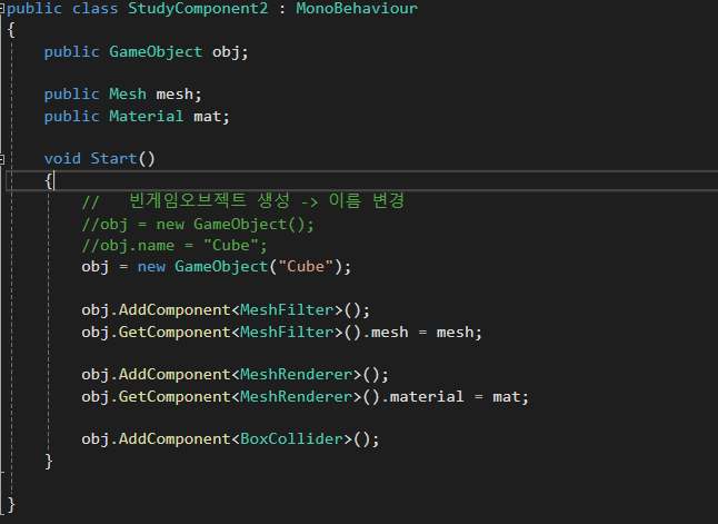 게임 오브젝트에 AddComponent로 MeshFilter와 MeshRenderer, BoxCollider 3개 Component 추가 밑 Mesh, Material 타입 추가