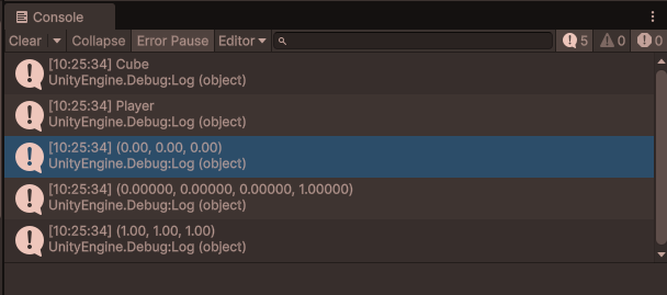 Debug.Log($"<color=#FFFF00>회전 : {obj.transform.rotation}</color>"); //게임오브젝트의 Transform 컴포넌트의 회전