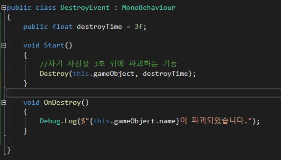 Destroy는 오브젝트를 파괴하는 기능으로 매개 변수로 들어간 게임 오브젝트를 파괴함 오브젝트3개를 만들어 스크립트를 넣어주고 실행하면 오브젝트들이 비활성화 되는 모습을 볼수있음